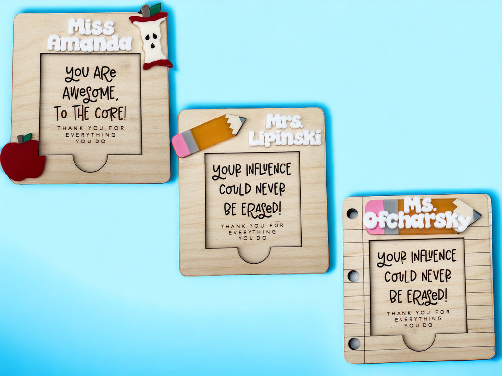 Thank that special Teacher in your kiddos life with this 3D acrylic layered, wood post it note holder.